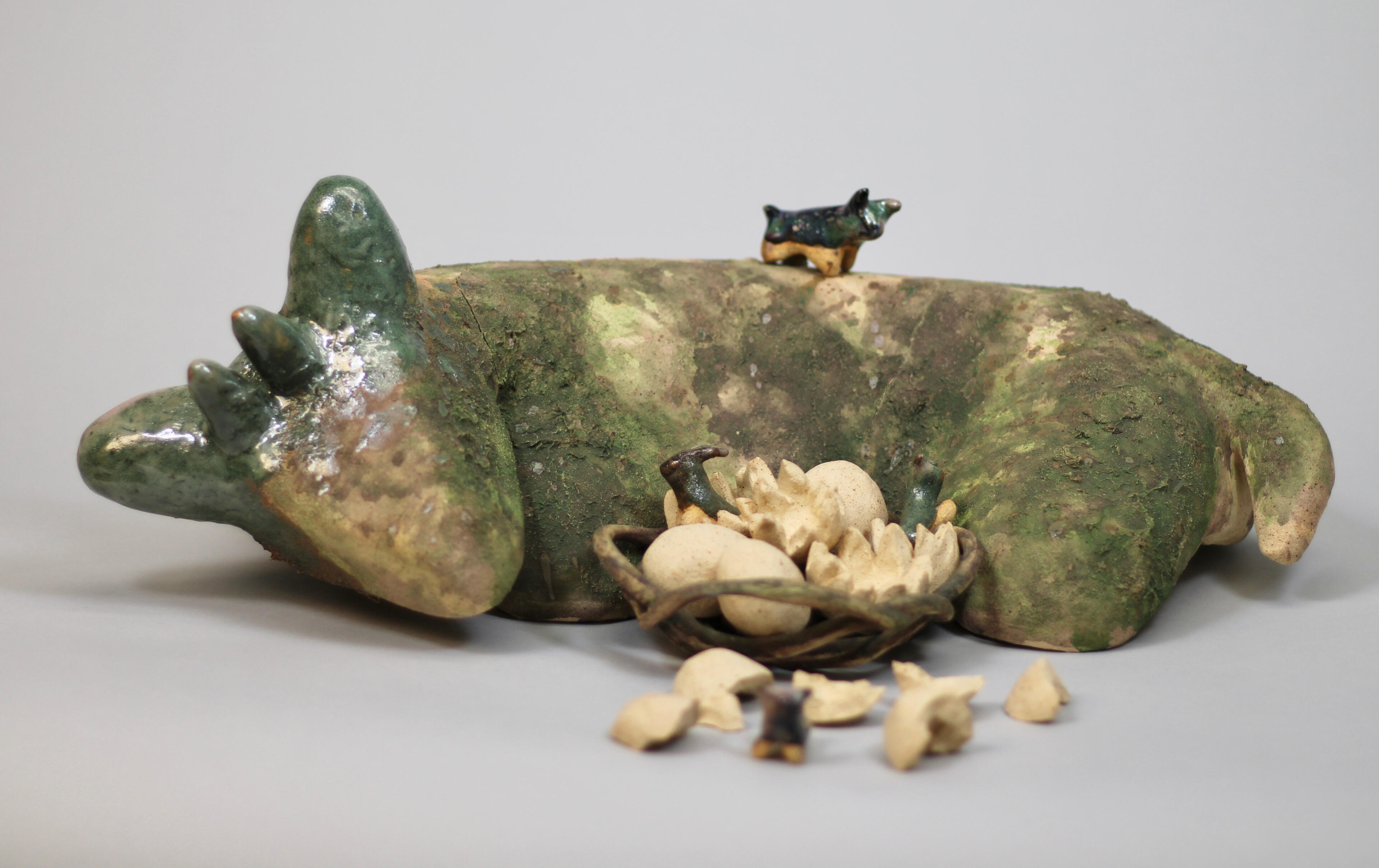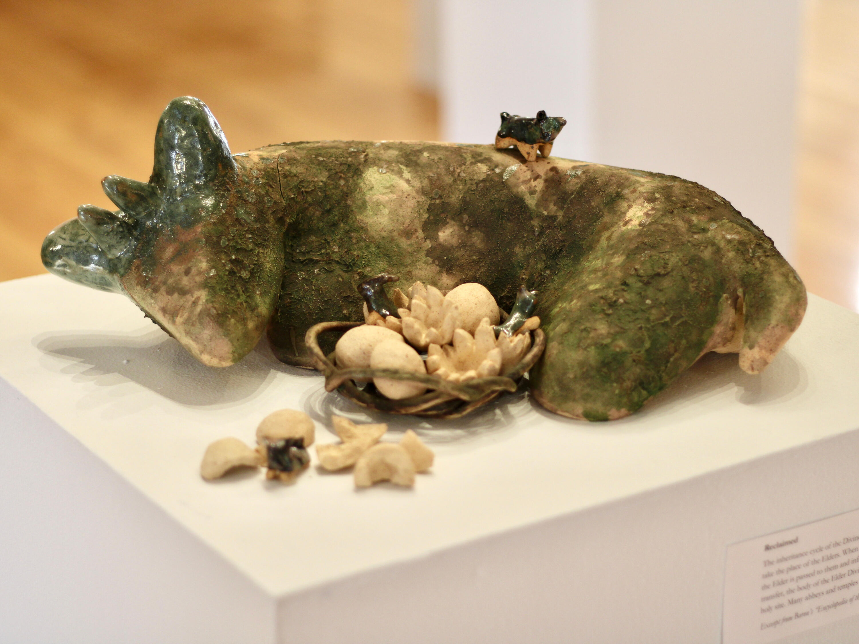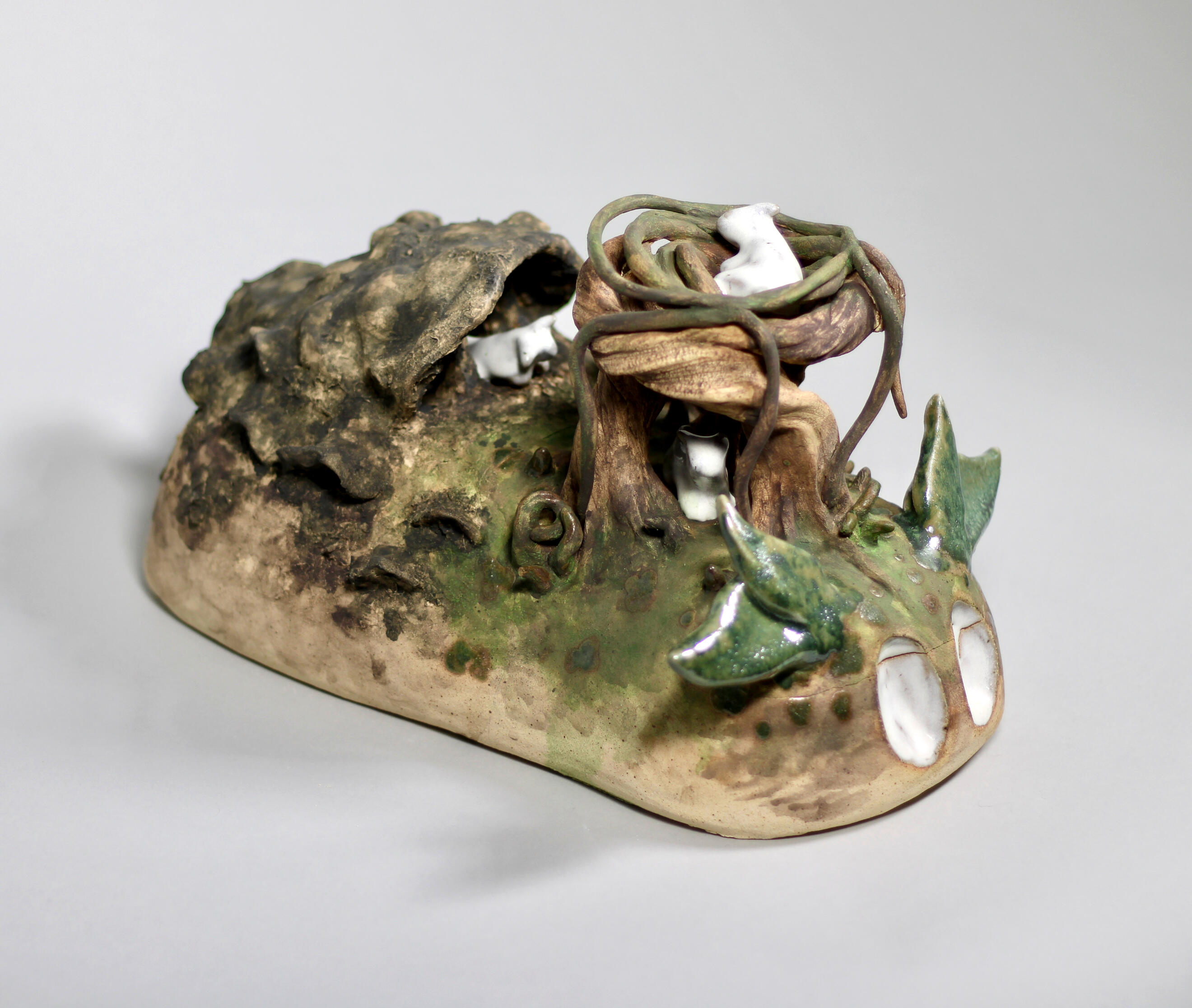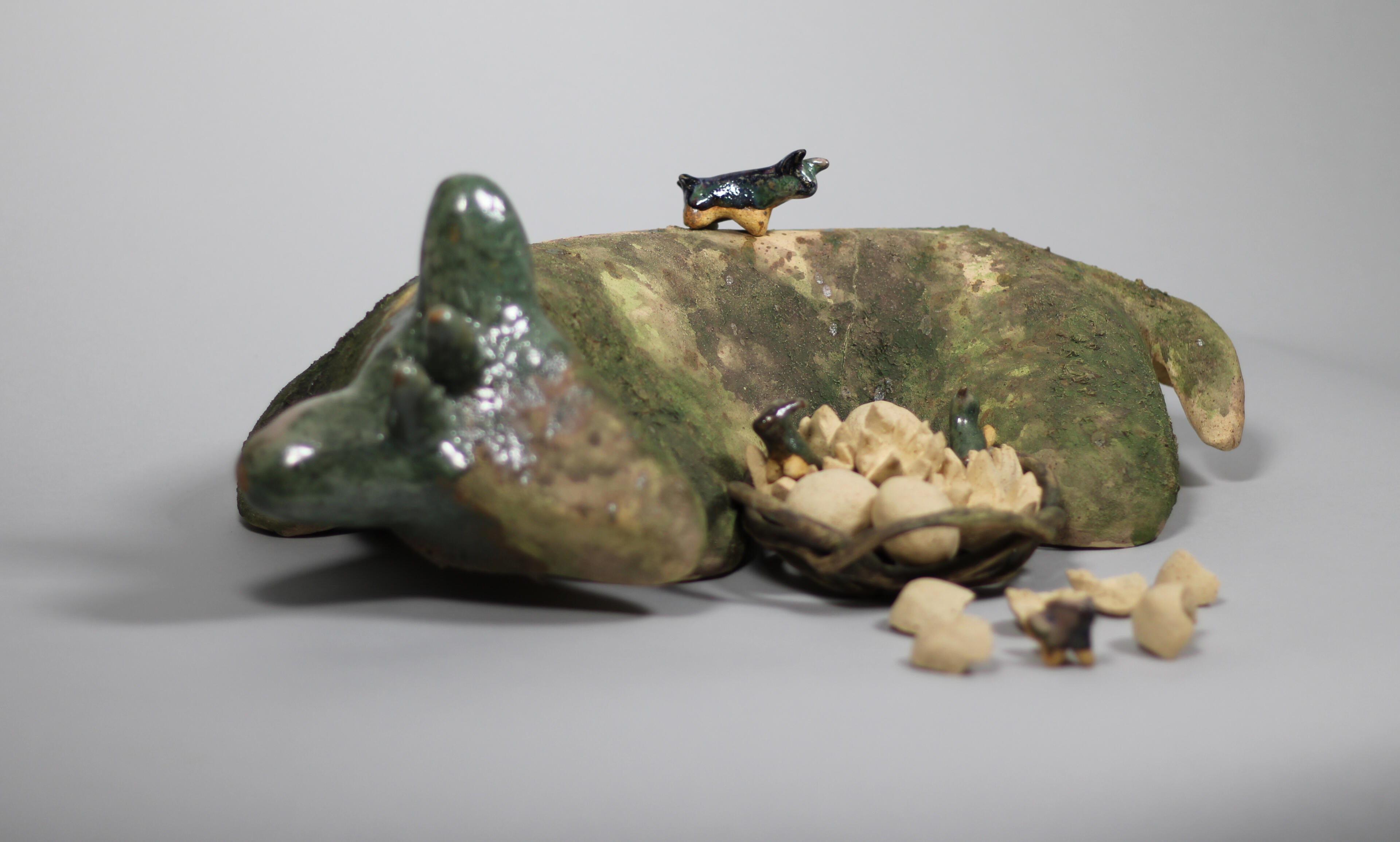 Story keeping is the art and craft of telling stories to keep them alive and pass them down. My work is created from the perspectives of different story keepers sharing tales of the Divine Age. “Flora and Fauna” acts as an entry point into a mythological world of divine figures and their foes, and the ones passing down the stories of these strange beings. I use clay to create simplified, whimsical animal sculptures to explore how myth, nature, and storytelling intersect.Mythology offers a way to explain the creation of the natural world and its inhabitants. Beyond this, myth provides the world with structure through religious practices and the concept of the ‘Divine.’ I have created a narrative exploring both