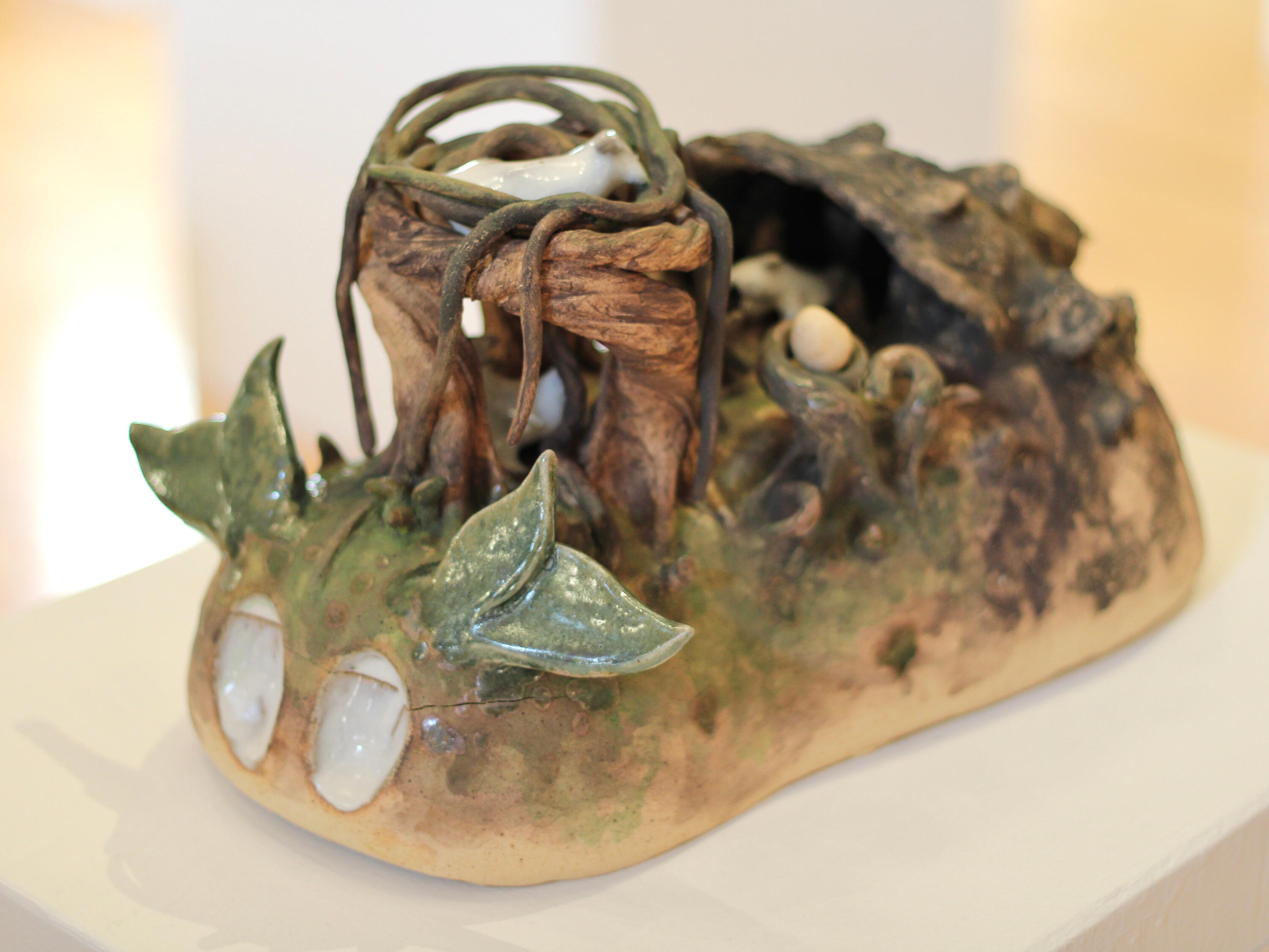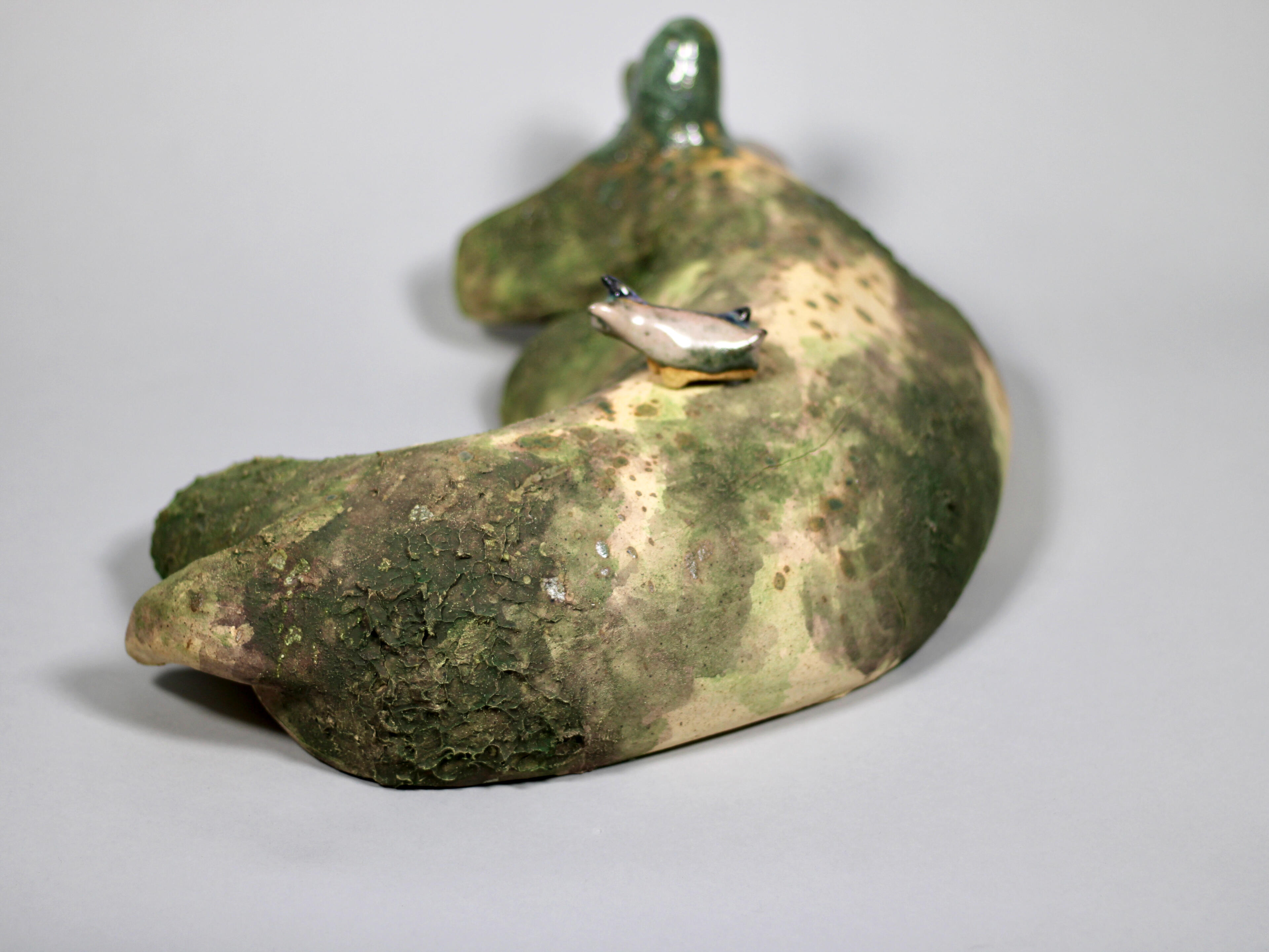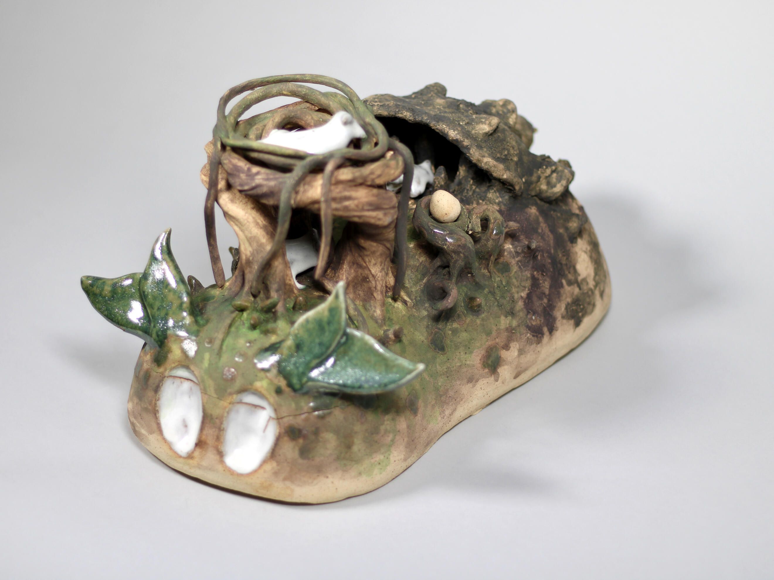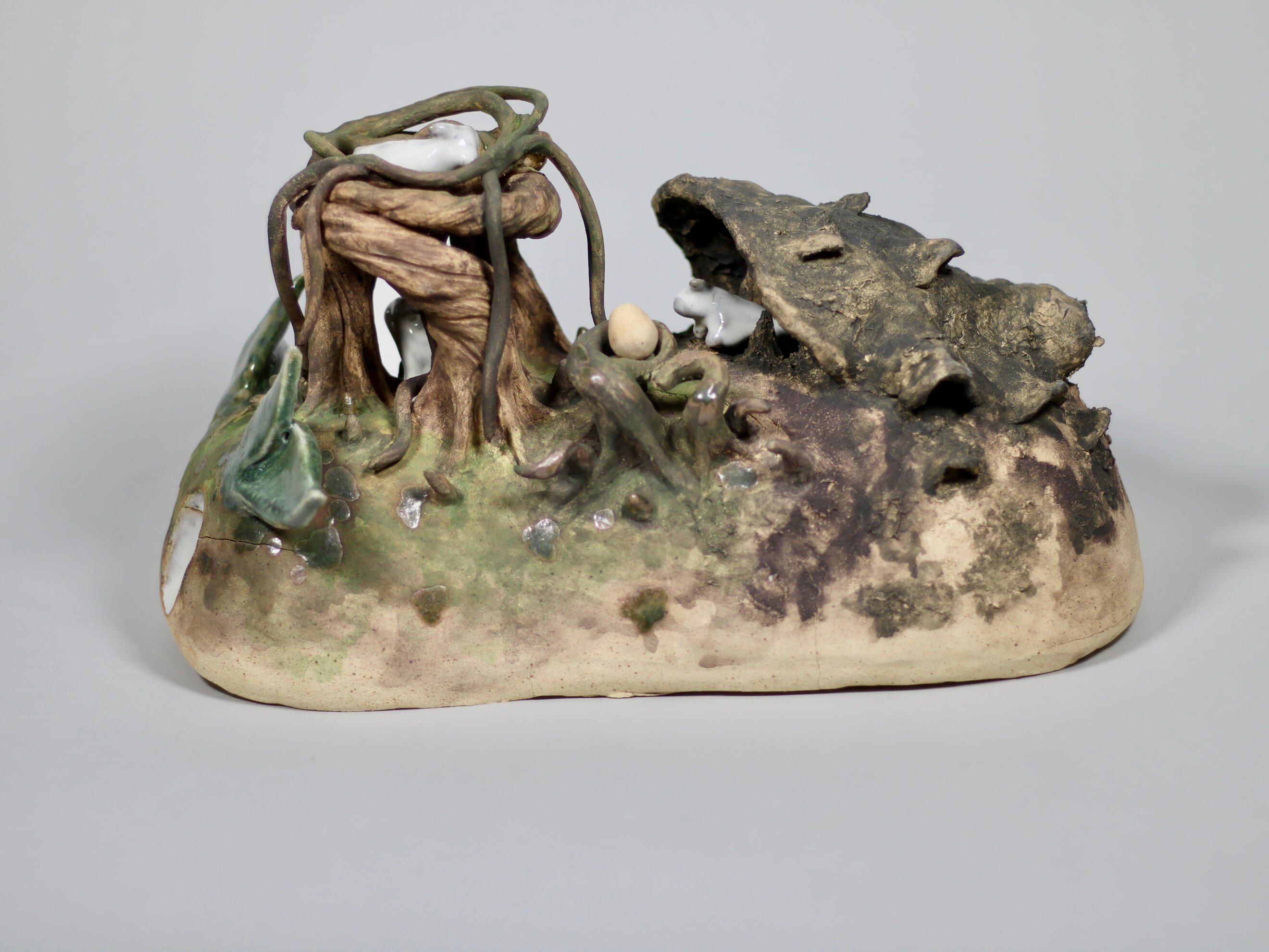 Story keeping is the art and craft of telling stories to keep them alive and pass them down. My work is created from the perspectives of different story keepers sharing tales of the Divine Age. “Flora and Fauna” acts as an entry point into a mythological world of divine figures and their foes, and the ones passing down the stories of these strange beings. I use clay to create simplified, whimsical animal sculptures to explore how myth, nature, and storytelling intersect.Mythology offers a way to explain the creation of the natural world and its inhabitants. Beyond this, myth provides the world with structure through religious practices and the concept of the ‘Divine.’ I have created a narrative exploring both